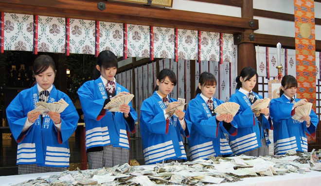 商売繁盛を願う「十日戎」でにぎわった、大阪市浪速区の今宮戎神社で、さい銭勘定のお手伝いをしました。 1月12日の午前9時から、おはらいを受けた当行職員が拝殿に広げられたさい銭を手際よく仕分けました。さい銭は紙幣や硬貨の他、「1129(いい福)」「29451(福よ来い)」などの縁起を担いだ金額の小切手もありました。