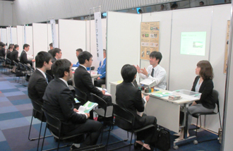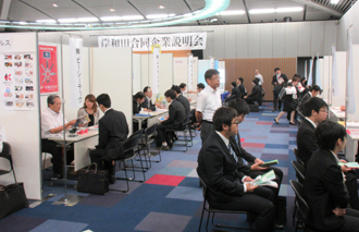 当日、32社の出展ブースでは、来春大学卒業予定者等延べ155名の方が真剣なまなざしで企業担当者の説明に耳を傾けていました。また、主催者がガイド役となり出展企業のPRをサポートする「企業案内ガイド」を行なうなど、終始活気あふれる合同企業説明会となりました。