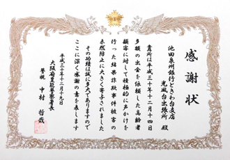 当行では、日頃から振り込め詐欺等の防止に向けて啓蒙活動や訓練を行っておりますが、12月14日、ときわ台支店光風台出張所において、現金出金の依頼を受けたお客様にご事情をお伺いし、警察と連携したことで、詐欺被害を未然に防いだことから、12月19日、大阪府豊能警察署から感謝状をいただきました。