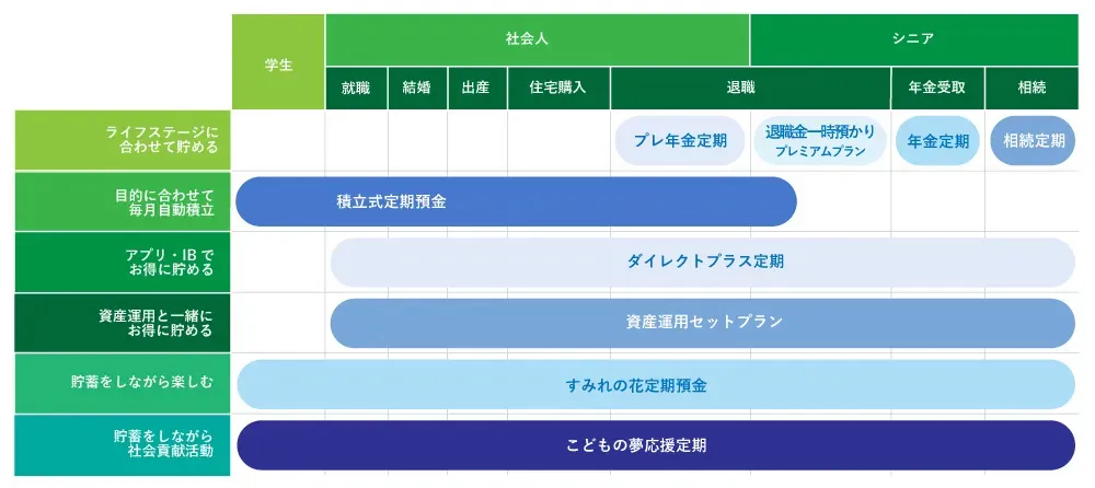 たとえば、池田泉州銀行の場合では、利用者のライフステージ(学生・社会人・シニア)に合わせて必要となる定期預金商品をラインアップしているのが特徴です。