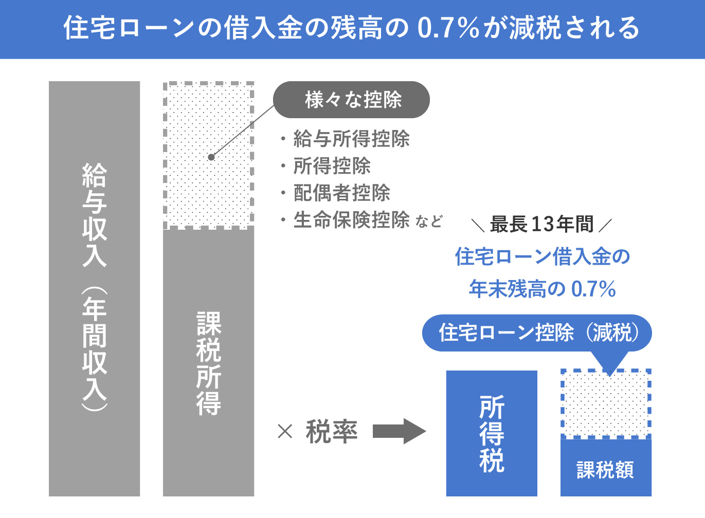 住宅ローンを利用して、新築住宅や中古住宅を購入またはリフォームした場合に、一定の条件を満たしていれば、住宅ローンによる借入金の年末残高の0.7%が、最長13年間にわたって所得税から控除されます。