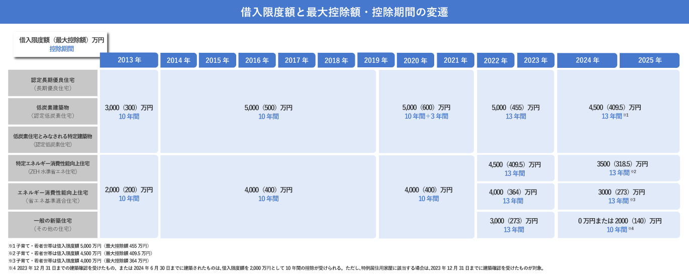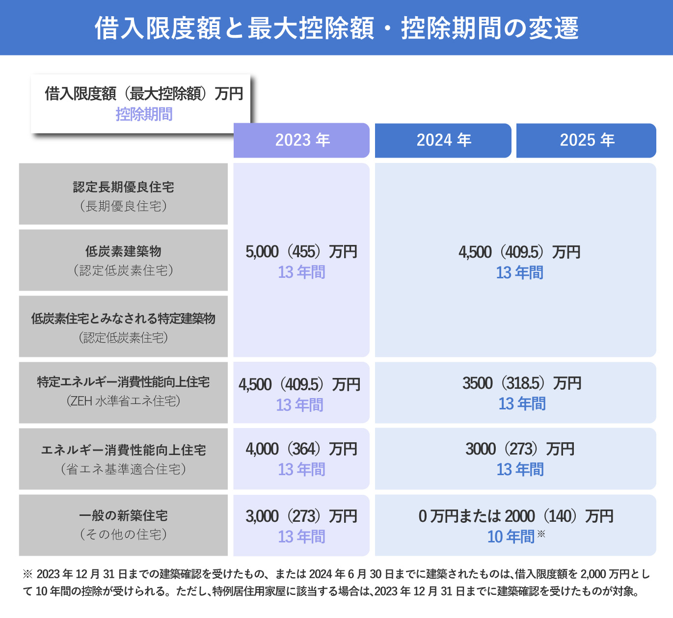 ただし、2023年末までに建築確認を受けた新築住宅に、2024年・2025年に入居する場合の借入限度額は2,000万円、控除期間は10年となります。