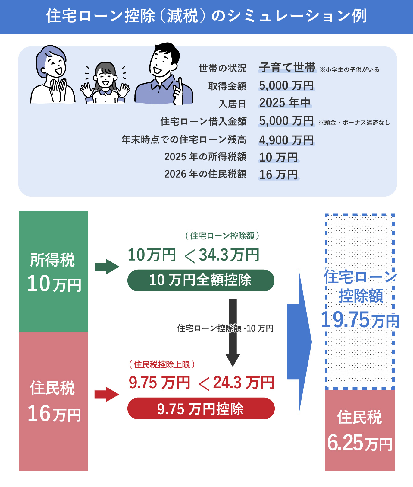 一方で、住宅ローン控除は主に所得税から控除され、余った分が住民税から控除されますが、住民税の控除には上限(所得税課税所得の5% / 最大9.75万円)があります。