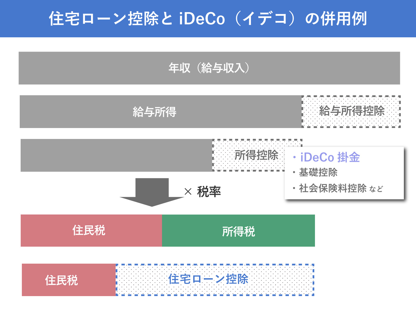 iDeCoと住宅ローン控除を併用する場合、iDeCoは所得控除のため、その掛金の分だけ課税所得が減り、結果として所得税が減ります。