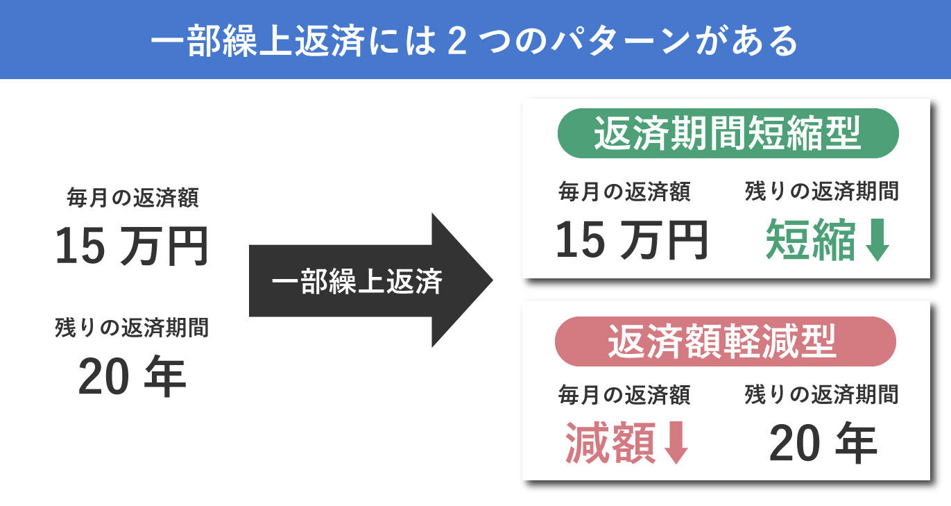 返済期間を短くする返済期間短縮型と、月々の支払金額を減らす返済額軽減型の2つの方法があります。