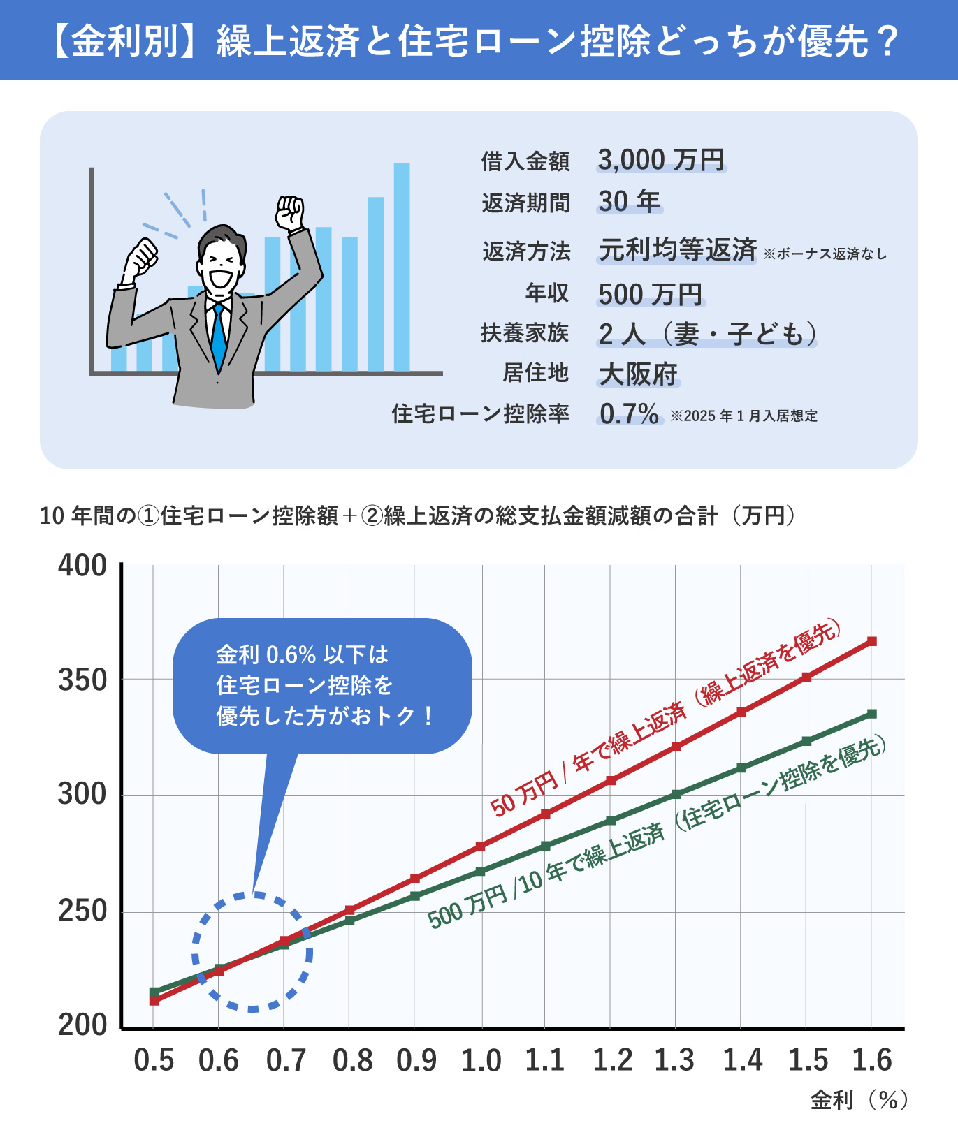 この条件では、0.6%以下の金利で借入を行う場合は、住宅ローン控除を優先して10年間は繰上返済をしないほうがお得であることがわかります。